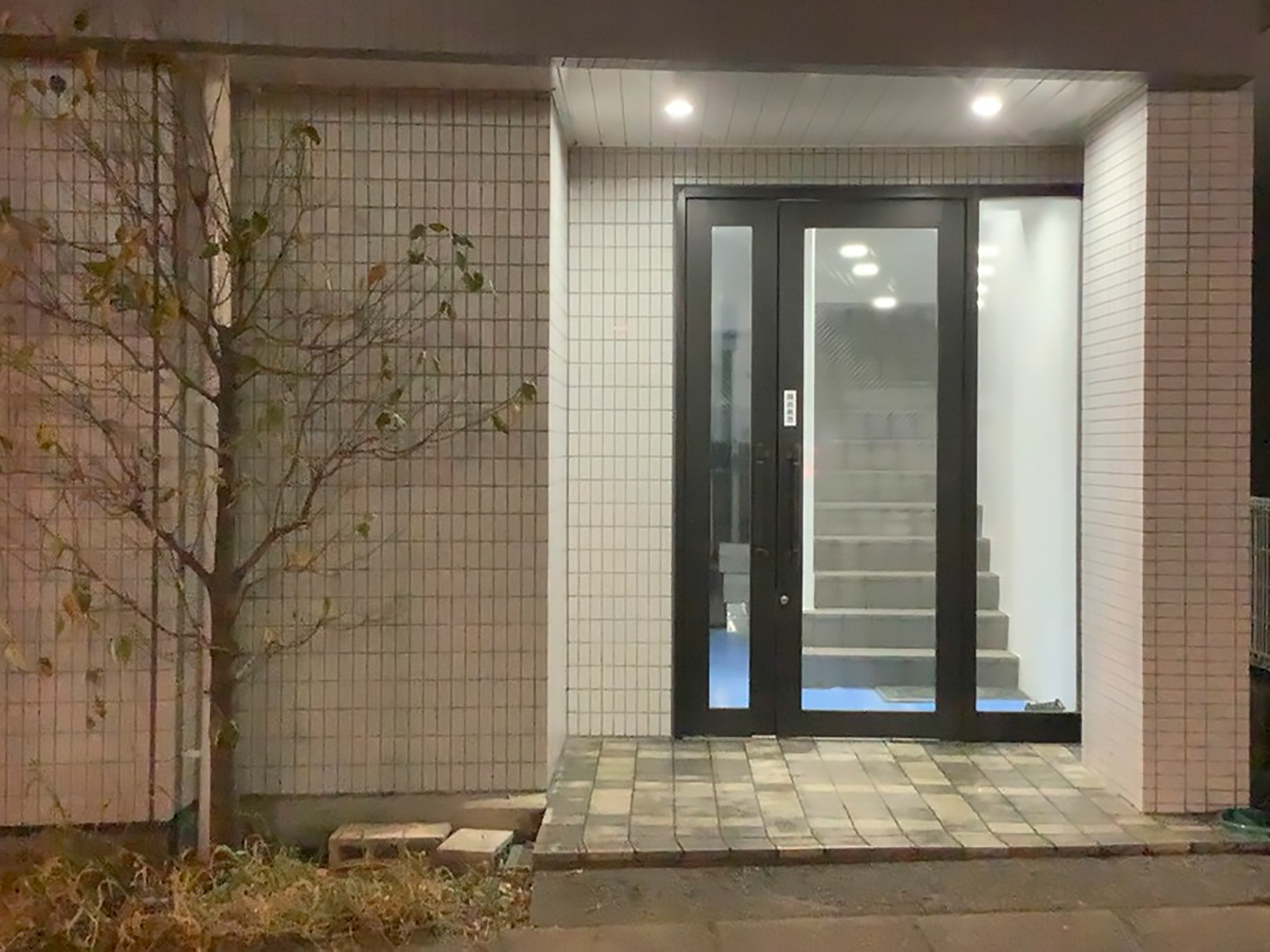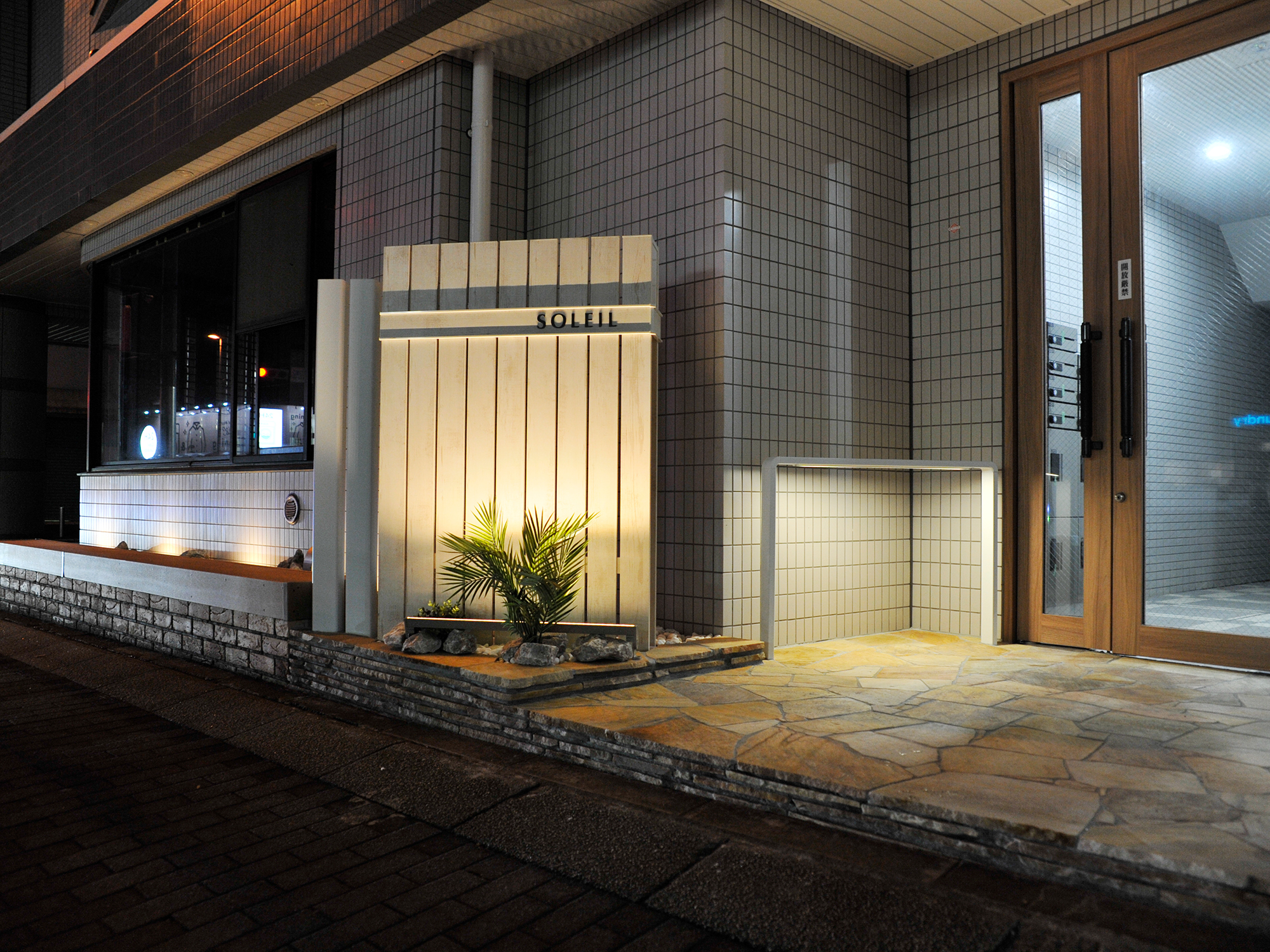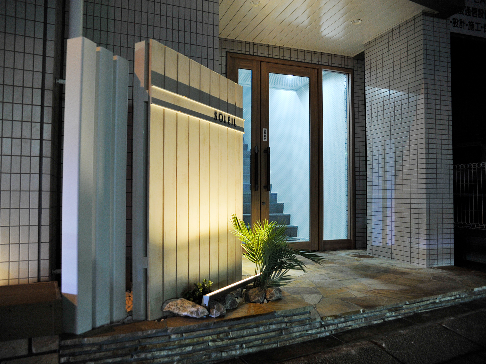 賃貸マンションのエントランスのリノベーションと、ライティング設備の設置を含めた外構工事を行いました。