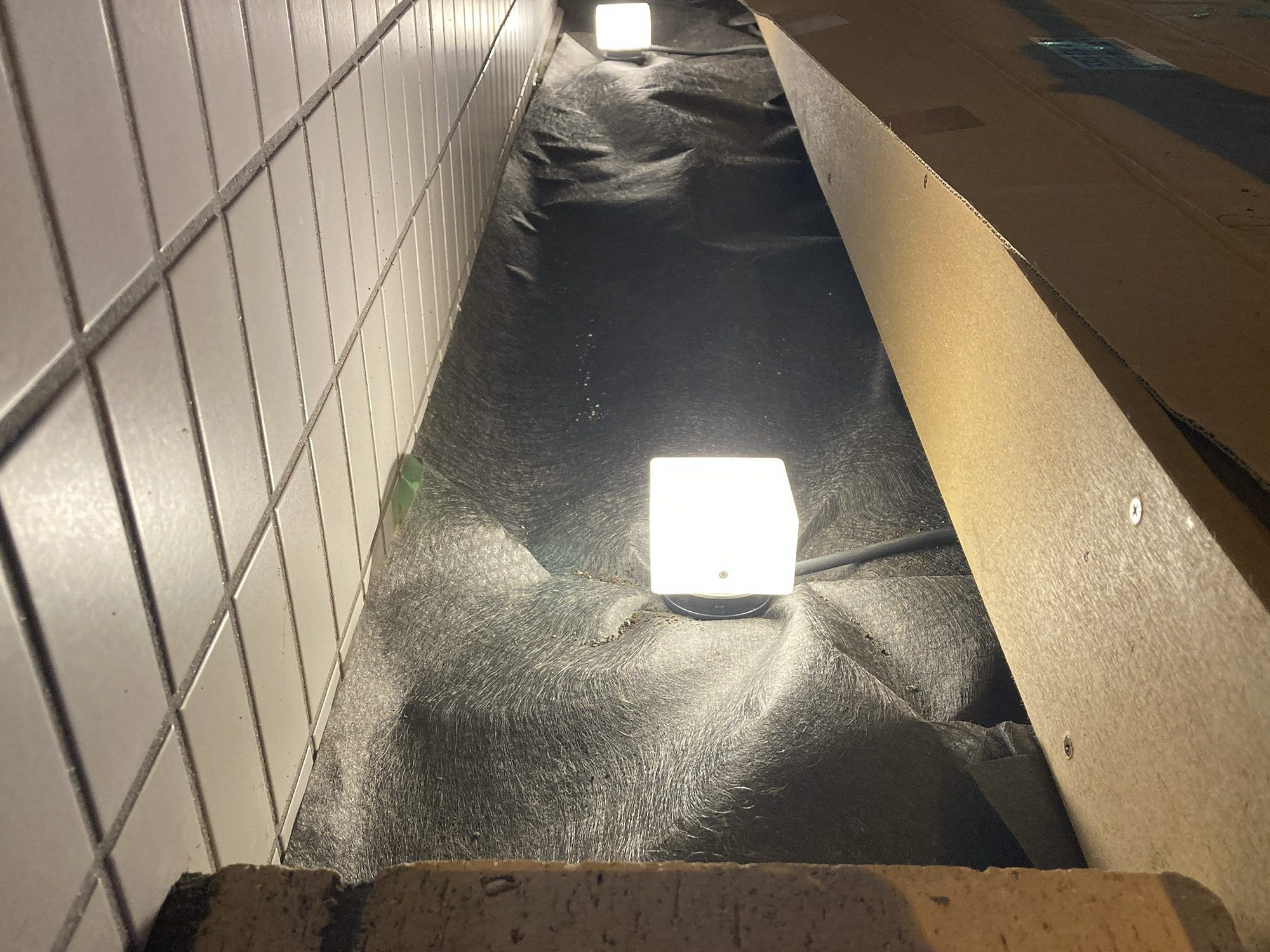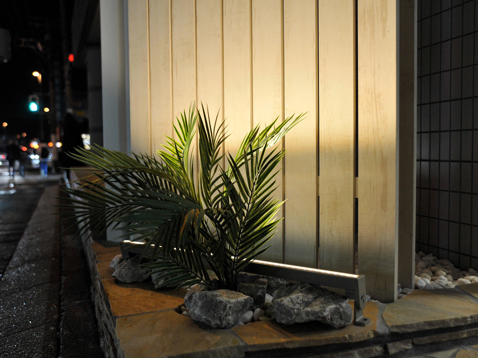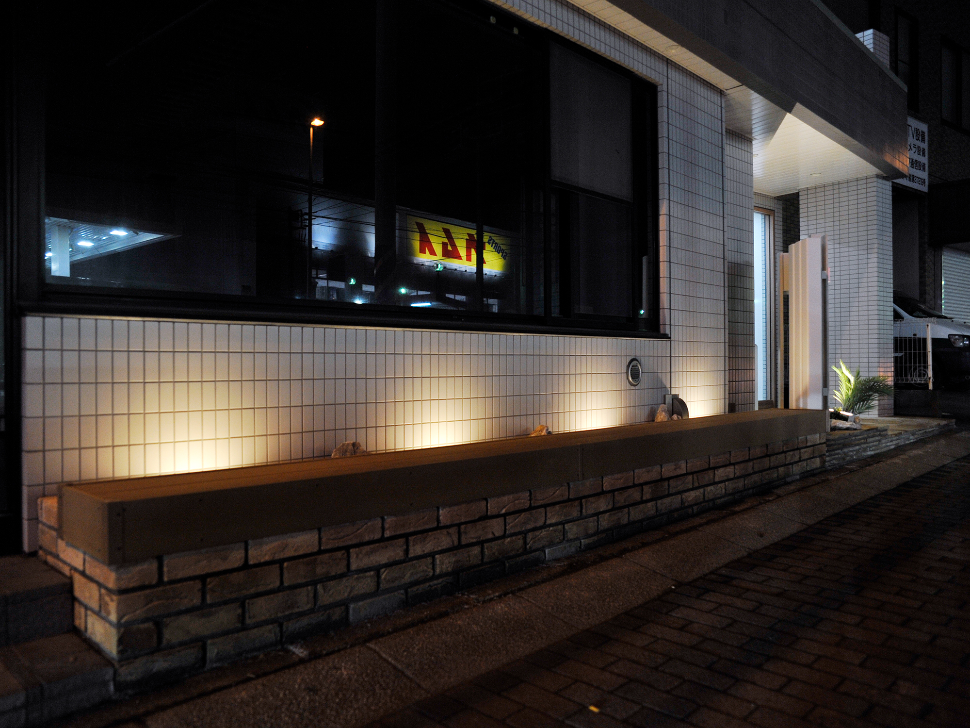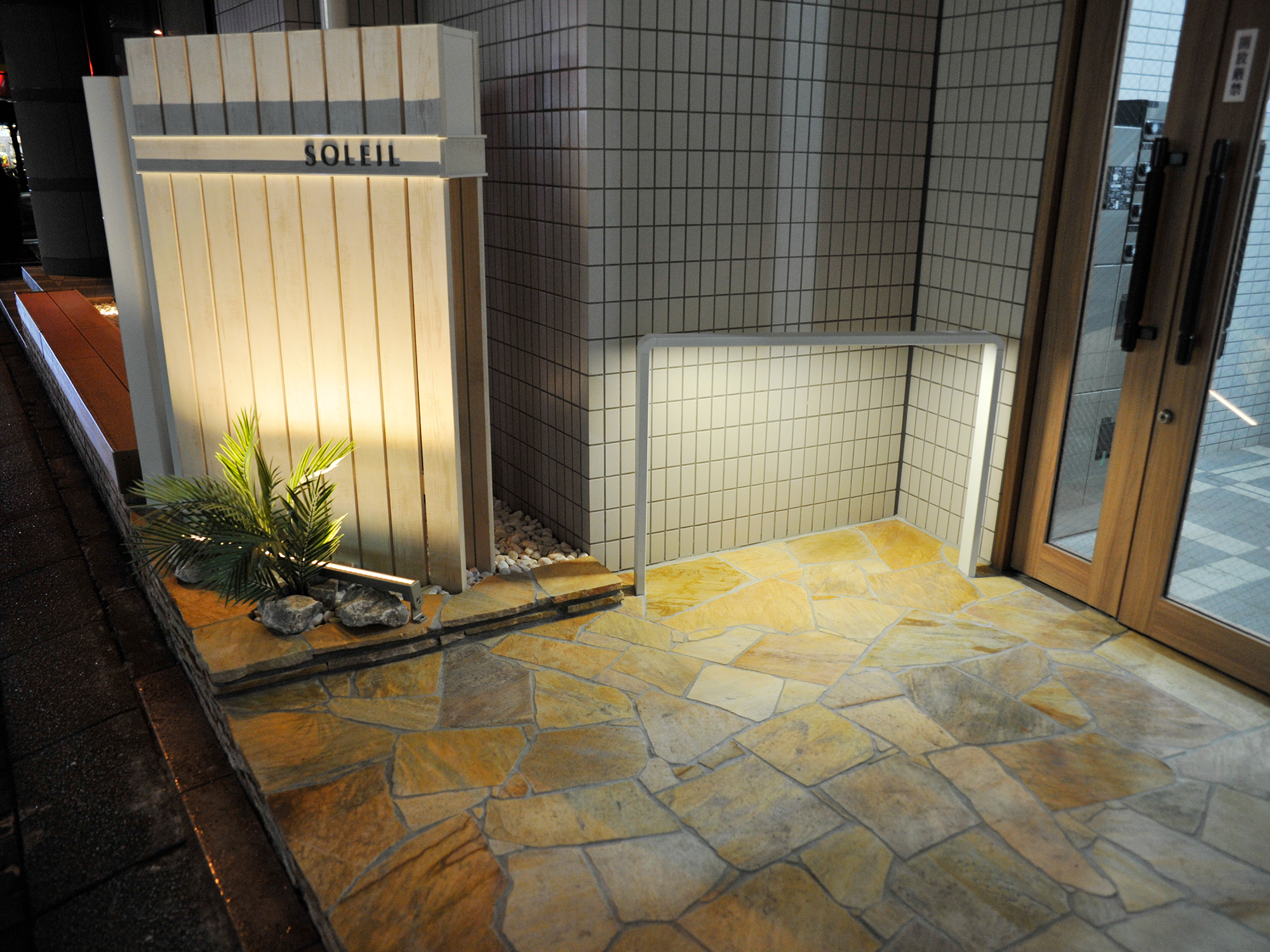 賃貸マンションのエントランスのリノベーションと、ライティング設備の設置を含めた外構工事を行いました。